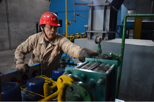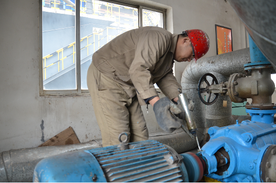 余熱發(fā)電中控員張明正在對(duì)真空泵進(jìn)行壓油