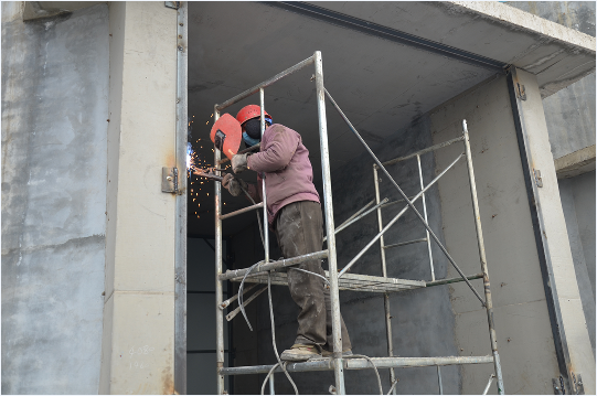 維修工王克兵正在焊制倉(cāng)庫(kù)門(mén)框