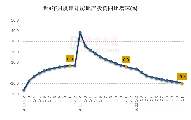 宏觀層面,我國持續(xù)推進(jìn)穩(wěn)經(jīng)濟(jì)政策措施落地見效,但受國內(nèi)疫情沖擊等因素影響,固定資產(chǎn)投資增速有所回落。各地積極推進(jìn)重大項目建設(shè),適度超前開展基礎(chǔ)設(shè)施投資,支撐基礎(chǔ)設(shè)施投資連續(xù)加快,其中,水利管理業(yè)投資同比快速增長,道路運(yùn)輸業(yè)投資增速有所回落,鐵路運(yùn)輸業(yè)投資轉(zhuǎn)為正增長。房地產(chǎn)投資方面,盡管政策利好不斷,但從市場表現(xiàn)看,“探底”仍在持續(xù)。1-11月,全國月度累計房地產(chǎn)開發(fā)投資同比降幅繼續(xù)擴(kuò)大,房地產(chǎn)開發(fā)企業(yè)房屋施工面積、新開工面積和土地購置面積同比降幅均有所擴(kuò)大。