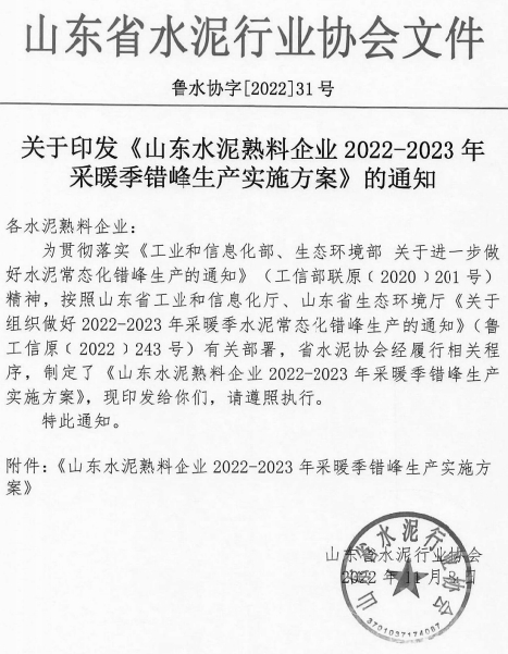 11月8日,山東省工業(yè)和信息化廳,生態(tài)環(huán)境廳發(fā)布《山東省工業(yè)和信息化廳山東省生態(tài)環(huán)境廳關(guān)于組織做好2022-2023年采暖季水泥常態(tài)化錯(cuò)峰生產(chǎn)的通知》(魯工信原[2022]243號(hào)),《通知》中要求全省水泥熟料企業(yè)的所有熟料生產(chǎn)線(含特種水泥熟料生產(chǎn)線)在2022年11月15日0:00-2023年3月15日24:00進(jìn)行錯(cuò)峰生產(chǎn)。