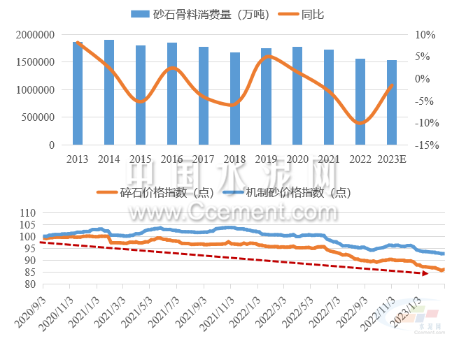 預計2023年需求偏穩(wěn)運行,二季度后需求或有所反彈。根據(jù)水泥、混凝土的需求預期,預計2023年全國砂石骨料需求同比偏穩(wěn)運行,或有小幅下滑。在供需反向變動的預期下,長期價格進入下行區(qū)間,預計2023年砂石價格中樞仍將小幅下移。
