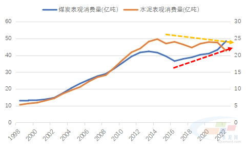 圖2:煤炭行業(yè)與水泥行業(yè)表觀消費(fèi)量走勢(shì)