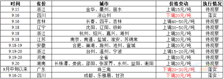 9月中旬以來,華東安徽、江蘇、浙江地區(qū),東北遼寧、吉林地區(qū)以及中南河南、湖南地區(qū)等密集上調(diào)水泥價格,執(zhí)行情況待觀察,但也有四川、廣東等少部分地區(qū)仍在下調(diào)水泥價格,且均已落實(shí)??偟膩砜?,市場漲價氛圍濃厚,但上漲動力似乎不足。筆者認(rèn)為,需求恢復(fù)偏慢且整體偏弱是當(dāng)前行業(yè)漲價難以完全落實(shí)的根本原因,今年9月難言“旺季”,漲價空間有待觀察。