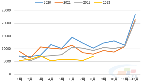 圖3:2023年1-8月100大中城市土地成交面積處于同期低位(萬平方米)