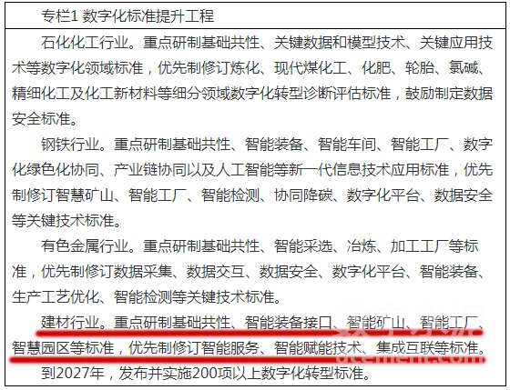 建材行業(yè)。重點研制基礎(chǔ)共性、智能裝備接口、智能礦山、智能工廠、智慧園區(qū)等標(biāo)準(zhǔn),優(yōu)先制修訂智能服務(wù)、智能賦能技術(shù)、集成互聯(lián)等標(biāo)準(zhǔn)。