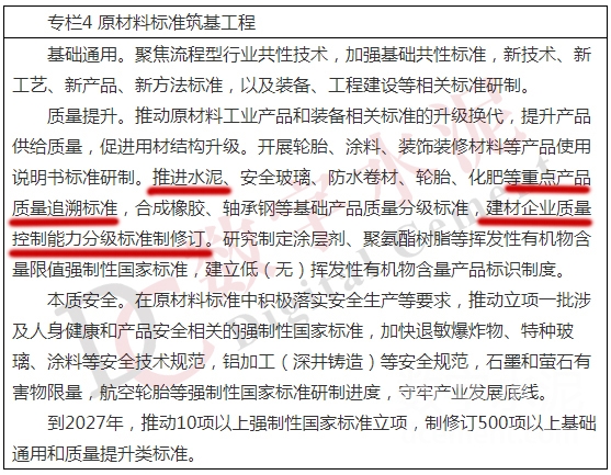質(zhì)量提升。推動原材料工業(yè)產(chǎn)品和裝備相關(guān)標(biāo)準(zhǔn)的升級換代,提升產(chǎn)品供給質(zhì)量,促進(jìn)用材結(jié)構(gòu)升級。推進(jìn)水泥、安全玻璃、防水卷材、輪胎、化肥等重點產(chǎn)品質(zhì)量追溯標(biāo)準(zhǔn),建材企業(yè)質(zhì)量控制能力分級標(biāo)準(zhǔn)制修訂。