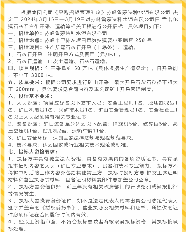 【招標公告】魯蒙水泥