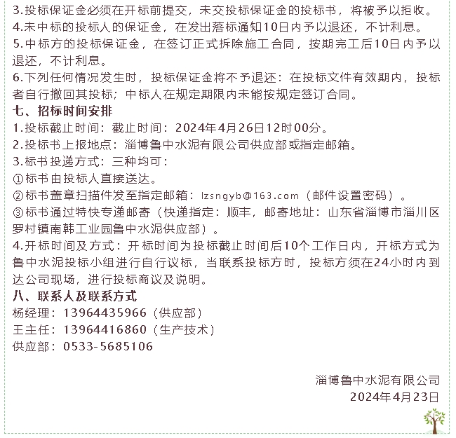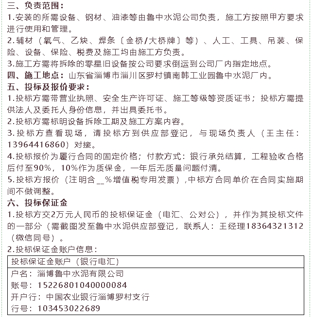 【招標(biāo)公告】魯中水泥除氯系統(tǒng)管路安裝項(xiàng)目、粉煤灰招標(biāo)
