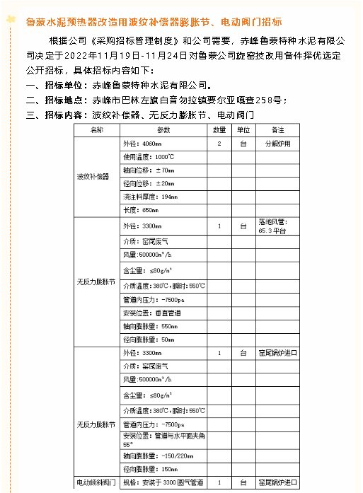【招標(biāo)公告】魯蒙水泥風(fēng)機(jī)、鋼材、硅酸鈣板、納米隔熱板、錨固件、波紋補(bǔ)償器膨脹節(jié)、電動(dòng)閥門(mén)招標(biāo)