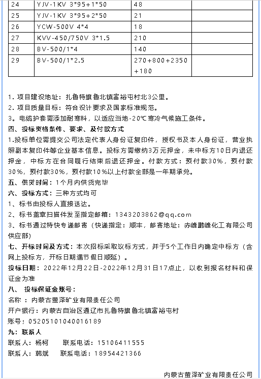 【招標(biāo)公告】螢澤礦業(yè)油浸變壓器、低壓配電柜、電纜材料招標(biāo)公告
