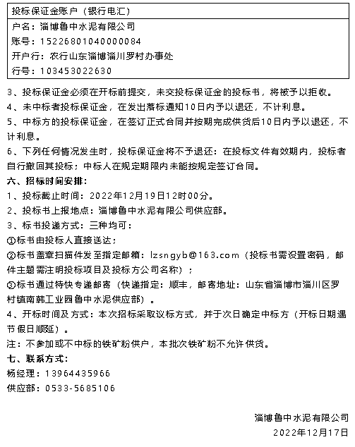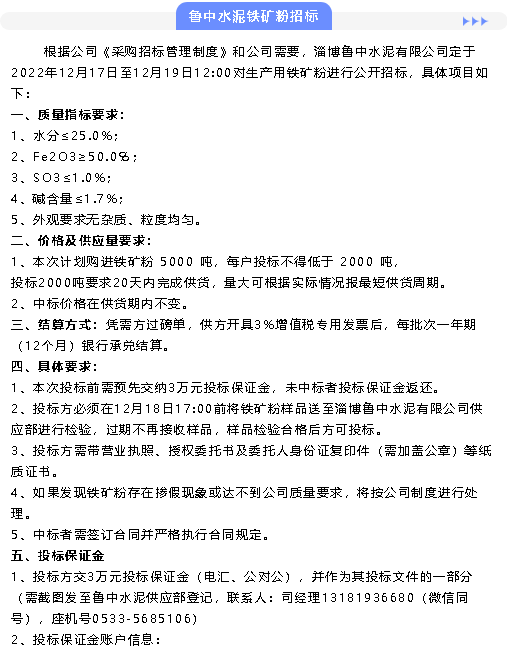 【招標公告】魯中水泥鐵礦粉、電纜線招標