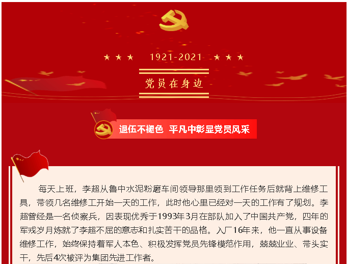 【黨員在身邊】 退伍不褪色 平凡中彰顯黨員風采—魯中水泥黨支部 李超(前河村)