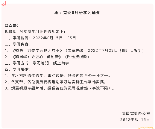 【通知】集團(tuán)黨委8月份學(xué)習(xí)通知