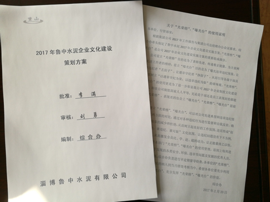 根據(jù)集團(tuán)公司2017年工作報(bào)告與集團(tuán)公司總經(jīng)理辦公會(huì)議要求,魯中水泥綜合辦組織制定了2017年魯中水泥企業(yè)文化建設(shè)實(shí)施方案。“光榮榜”、“曝光臺(tái)”作為2017年魯中水泥企業(yè)文化建設(shè)實(shí)施方案的重要組成部分,經(jīng)過積極準(zhǔn)備、籌劃,已于2017年2月20日在公司各部門懸掛到位,投入使用。