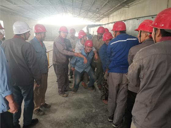 16:35,演練開始。粉磨車間副主任劉強接到通知,維修工在3#包機修理輸送皮帶時,操作工誤開啟設備,導致維修工左手夾在輸送皮帶與托輥之間,無法拿出。劉強隨即報告車間主任韓凱并趕往現(xiàn)場救援,同時韓凱召集各小組成員,啟動應急救援預案,攜帶救援、醫(yī)療物資前往現(xiàn)場。經(jīng)過搶險救援小組現(xiàn)場搶救,受傷人員手臂從皮帶上取下,醫(yī)療救護組對傷員進行止血等簡單治療,然后送往醫(yī)院進一步治療。