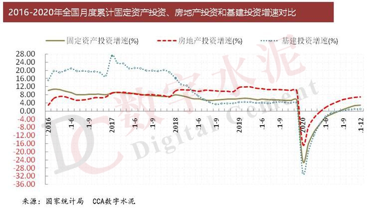 年初以來,面對新冠肺炎疫情的巨大沖擊和復(fù)雜的國內(nèi)外社會(huì)環(huán)境。為抑制經(jīng)濟(jì)下行,我國繼續(xù)加強(qiáng)宏觀政策逆周期調(diào)節(jié)力度,加快“六保”“六穩(wěn)”政策落地,落實(shí)各項(xiàng)重大改革舉措,充分發(fā)揮中國超大規(guī)模市場優(yōu)勢和內(nèi)需潛力,構(gòu)建國內(nèi)循環(huán)為主、國內(nèi)國際雙循環(huán)相互促進(jìn)的新發(fā)展格局,多措并舉鞏固經(jīng)濟(jì)復(fù)蘇向好態(tài)勢。積極的財(cái)政政策和穩(wěn)健的貨幣政策持續(xù)顯效發(fā)力,克服了疫情和汛情的不利影響,分階段、有節(jié)奏、有針對性地推出一系列政策舉措,經(jīng)濟(jì)快速回暖。尤其是水泥相關(guān)的固定資產(chǎn)投資、房地產(chǎn)投資、基建投資指標(biāo)快速回升明顯,使得2020年全年我國水泥需求總量未受影響,繼續(xù)保持在23~24億噸的高位平臺(tái)期。