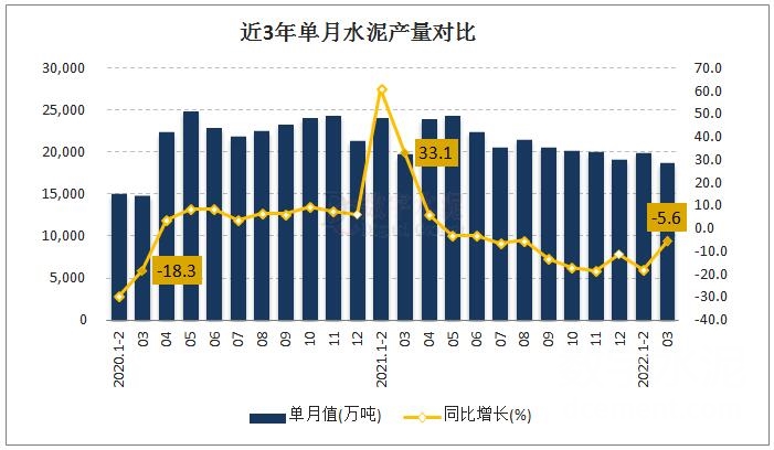 2022年一季度,全國(guó)累計(jì)水泥產(chǎn)量3.87億噸,同比下降12.1%,降幅較1-2月收窄5.7個(gè)百分點(diǎn),去年同期為增長(zhǎng)47.3%;3月份,全國(guó)單月水泥產(chǎn)量1.87億噸,同比下降5.6%,但仍處于2018年以來(lái)同期次好水平。
