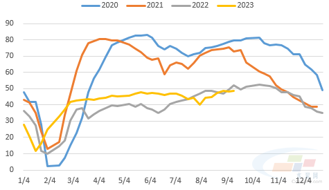 按照往年9月旺季節(jié)奏,水泥企業(yè)發(fā)運(yùn)率多在7-8成,華東和中南等需求旺盛地區(qū)甚至超過9成,然而目前全國水泥發(fā)運(yùn)率僅48.7%,不足五成,甚至不及2022年同期水平,華東、中南等熱門地區(qū)出貨量不足六成,盡管需求較之前邊際好轉(zhuǎn),但整體仍弱,水泥價格上漲的根基并不牢固。與此同時,磨機(jī)運(yùn)轉(zhuǎn)率穩(wěn)步提高,水泥庫容比達(dá)到74%高位,廠家?guī)齑娓咂?,價格上行壓力較大。