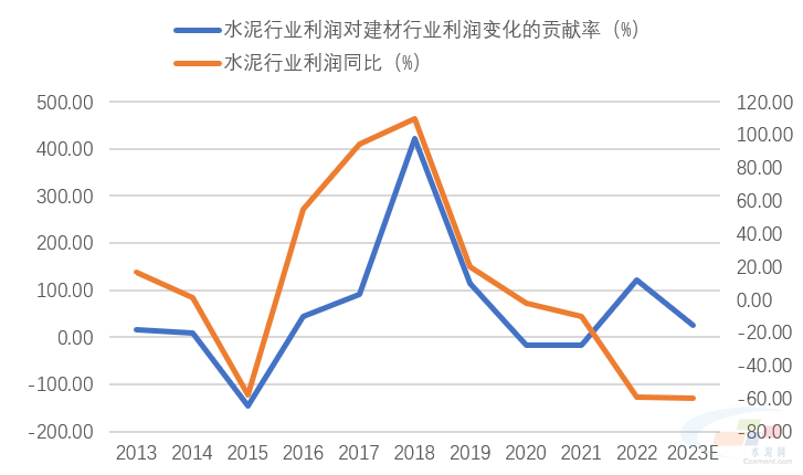 2022年,水泥行業(yè)營業(yè)收入占建材行業(yè)的14%,利潤總額占建材行業(yè)的14%,均低于總資產(chǎn)占比(20%),行業(yè)銷售利潤率也已經(jīng)低于建材行業(yè)平均水平。2023年,水泥行業(yè)景氣度進(jìn)一步下滑,上半年利潤總額大幅下滑60%,是拖累今年建材工業(yè)增加值增速明顯放緩的重要原因。作為建材行業(yè)第二大子行業(yè),水泥制造業(yè)的經(jīng)營穩(wěn)定對建材行業(yè)的穩(wěn)增長至關(guān)重要。從歷史數(shù)據(jù)看,水泥行業(yè)利潤的大幅波動,都會造成建材行業(yè)的利潤大幅度波動(圖2)。因此,筆者認(rèn)為,建材行業(yè)要實現(xiàn)穩(wěn)增長目標(biāo),水泥行業(yè)必須打頭陣,只有水泥行業(yè)穩(wěn)住并實現(xiàn)一定的增長,建材工業(yè)實現(xiàn)2023-2024年的增加值增速目標(biāo)才有希望。