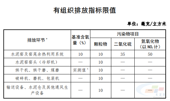 (一)有組織排放控制指標(biāo)。在基準(zhǔn)含氧量 10%的條件下,水泥 窯及窯尾余熱利用系統(tǒng)廢氣顆粒物、二氧化硫、氮氧化物排放濃度小時(shí)均值分別不高于 10mg/m3、35mg/m3、50mg/m3。其他有組織排放,氨等表中未作規(guī)定的按國(guó)家或地方標(biāo)準(zhǔn)執(zhí)行。達(dá)到超低排放的水泥企業(yè)每月生產(chǎn)時(shí)間至少 95%以上時(shí)段排放濃 度小時(shí)均值滿(mǎn)足上述要求。
