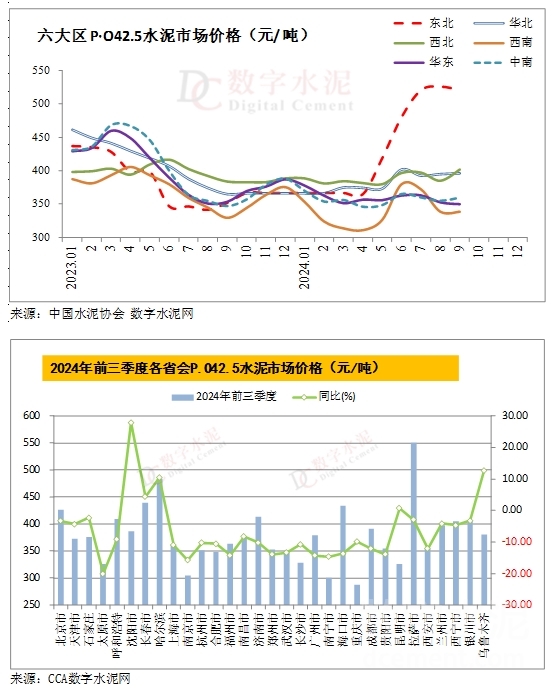 分區(qū)域來看,前三季度東北水泥價格獨占鰲頭,均價達437元/噸,遠超全國均價64元,同比增長12.8%,施工旺季更是飆升至522元/噸,較去年同期高出175元/噸。此成就得益于區(qū)內(nèi)企業(yè)嚴格執(zhí)行錯峰生產(chǎn),限產(chǎn)力度大,庫存低位,供需關(guān)系持續(xù)優(yōu)化。