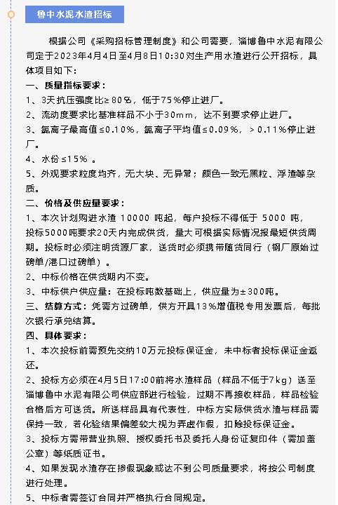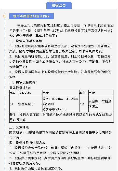 【招標(biāo)公告】魯中水泥雷達(dá)料位計(jì)、水渣招標(biāo)