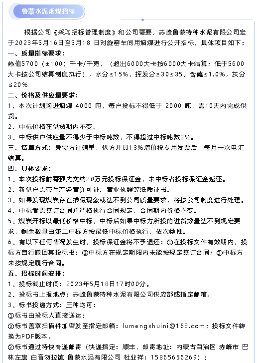 【招標公告】魯蒙水泥變頻器、廢舊鋼材、煙煤招標