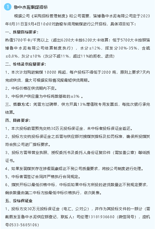 【招標(biāo)公告】魯中水泥煙煤、魯蒙水泥兩化融合管理體系貫標(biāo)評定招標(biāo)