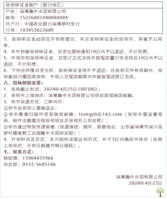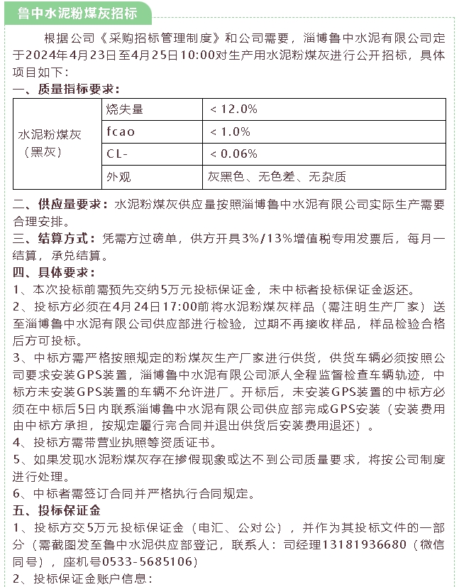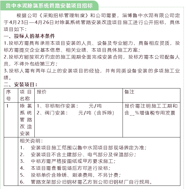 【招標(biāo)公告】魯中水泥除氯系統(tǒng)管路安裝項(xiàng)目、粉煤灰招標(biāo)