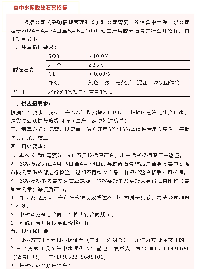 【招標(biāo)公告】魯中水泥高鉻鋼球、脫硫石膏招標(biāo)