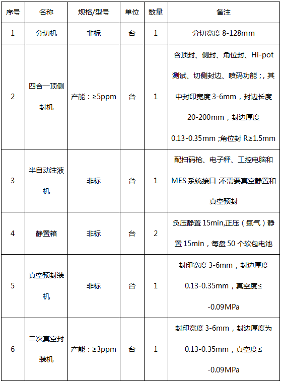 根據(jù)公司《采購招標(biāo)管理制度》,山東重山光電材料股份有限公司定于10月20日—10月30日對高比能鋰氟化碳電池中試線軟包電池部分設(shè)備招標(biāo),具體要求如下: