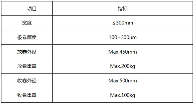 分切機(jī)用于輥壓后道工序,將輥壓好的成卷極片分切成兩個(gè)或者多個(gè)小卷,極片寬度≤350mm,分切寬度為8-128mm,分切速度≥15m/min;刀片為鎢鋼合金刀,刀架為130型。可通過更換隔套,實(shí)現(xiàn)不同的分切寬度。