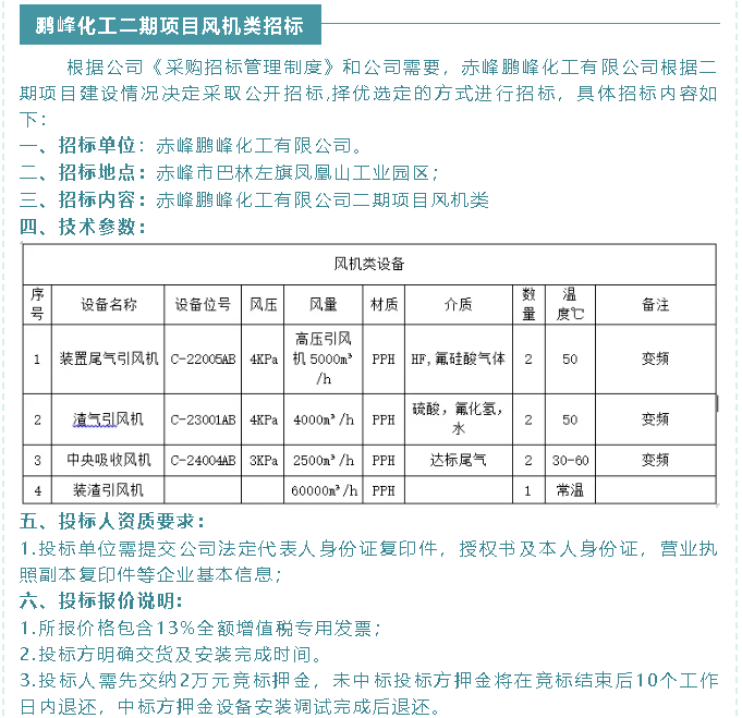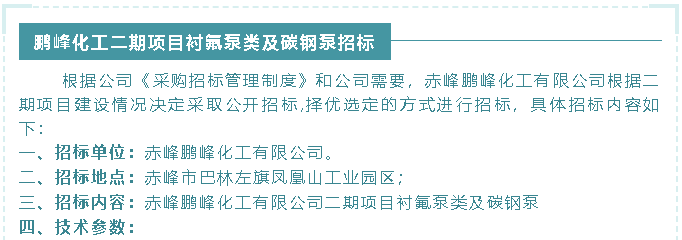 【招標公告】?鵬峰化工二期項目襯氟泵類及碳鋼泵、風機類招標