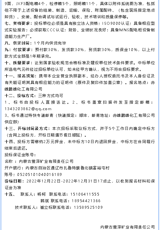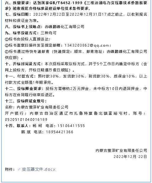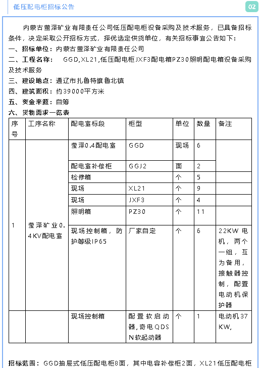 【招標(biāo)公告】螢澤礦業(yè)油浸變壓器、低壓配電柜、電纜材料招標(biāo)公告